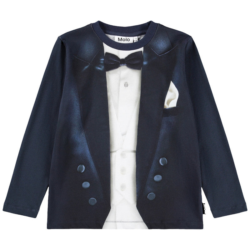 Navy blue long-sleeved T-shirt by Molo, featuring a cool tuxedo graphic on the front. Made in soft organic cotton jersey, this comfortable top showcases a realistic print of a dapper tuxedo, complete with waistcoat, pocket square, and bow tie.