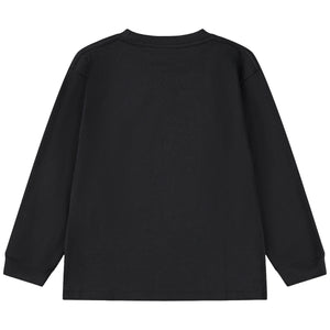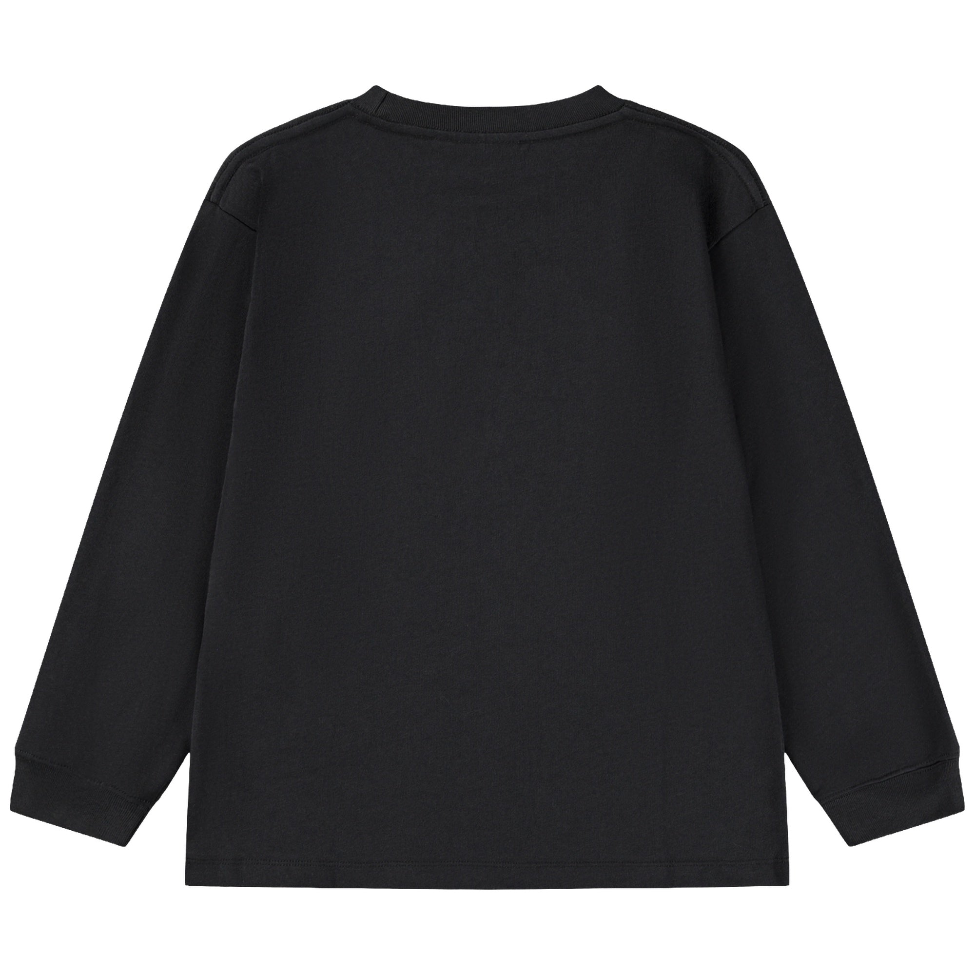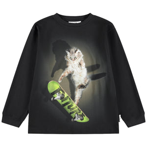 Black organic cotton top by Molo, made in soft and comfortable jersey. This relaxed, casual style has dropped shoulders and ribbed trims, with a fun cat on a skateboard print on the front.