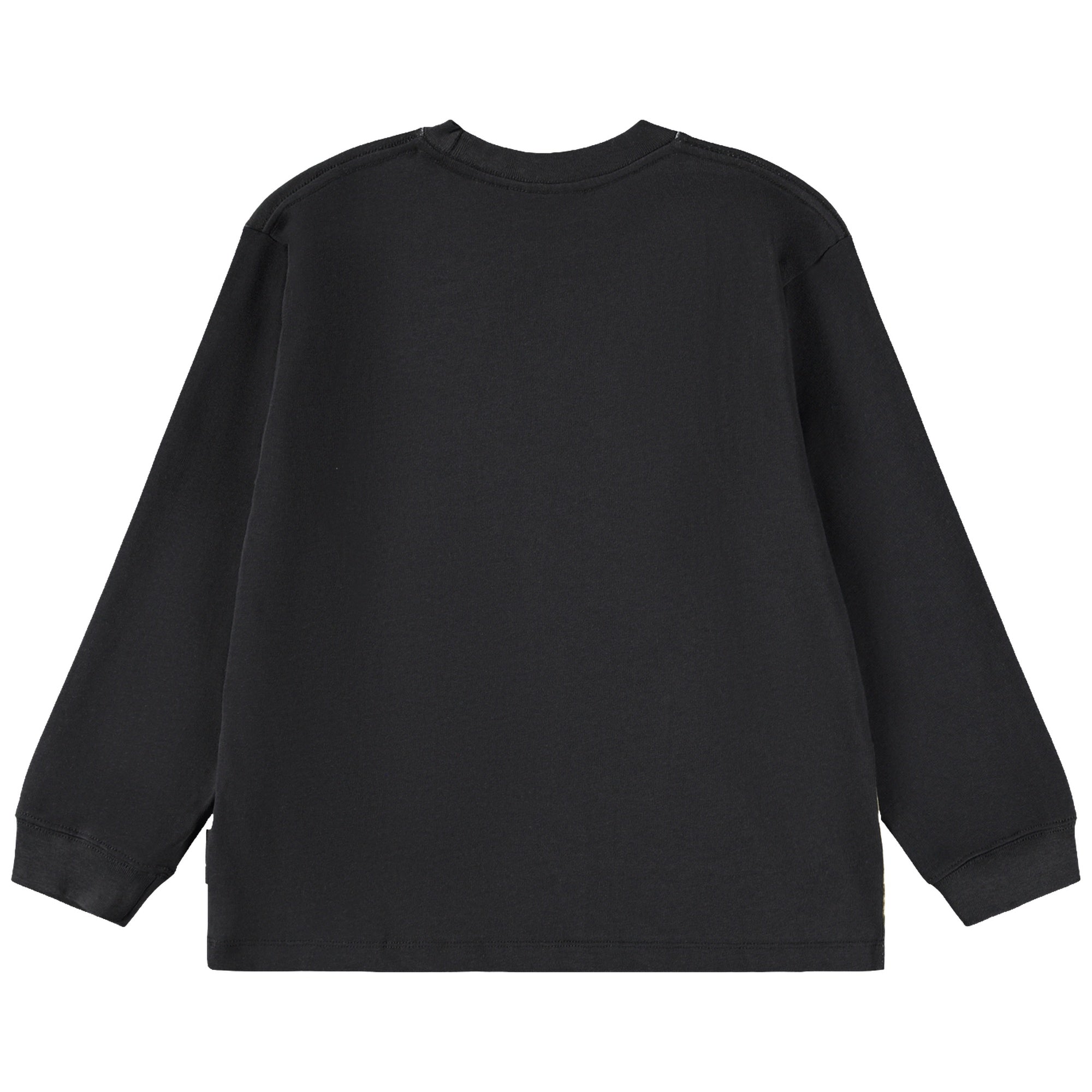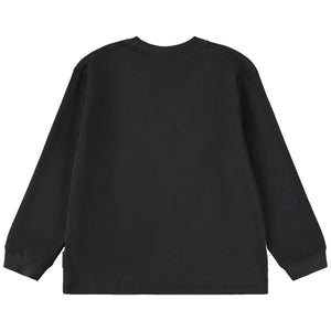 This black Molo long-sleeve shirt showcases a blazing orange sports car with open doors, emerging from a dark, fiery, forest setting.