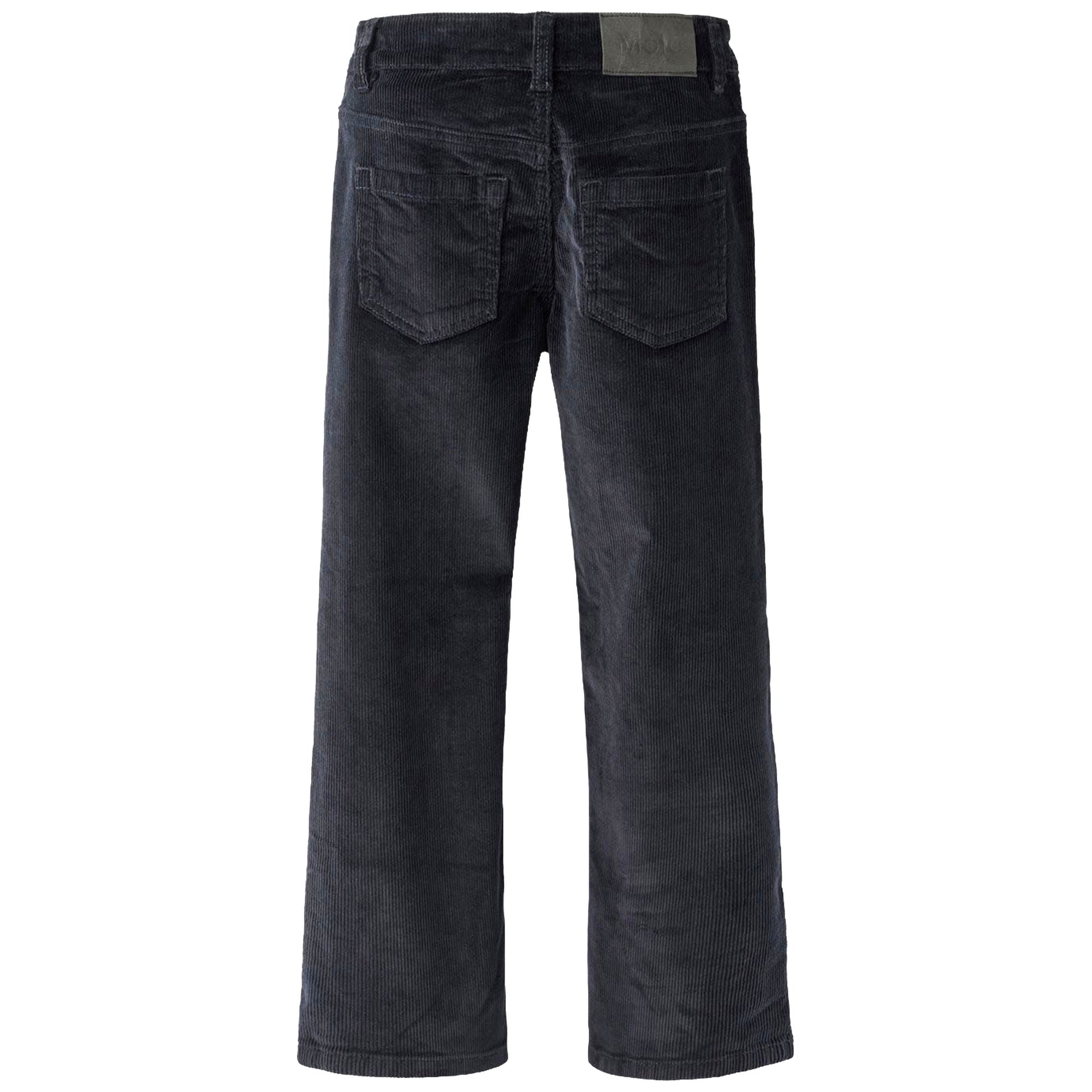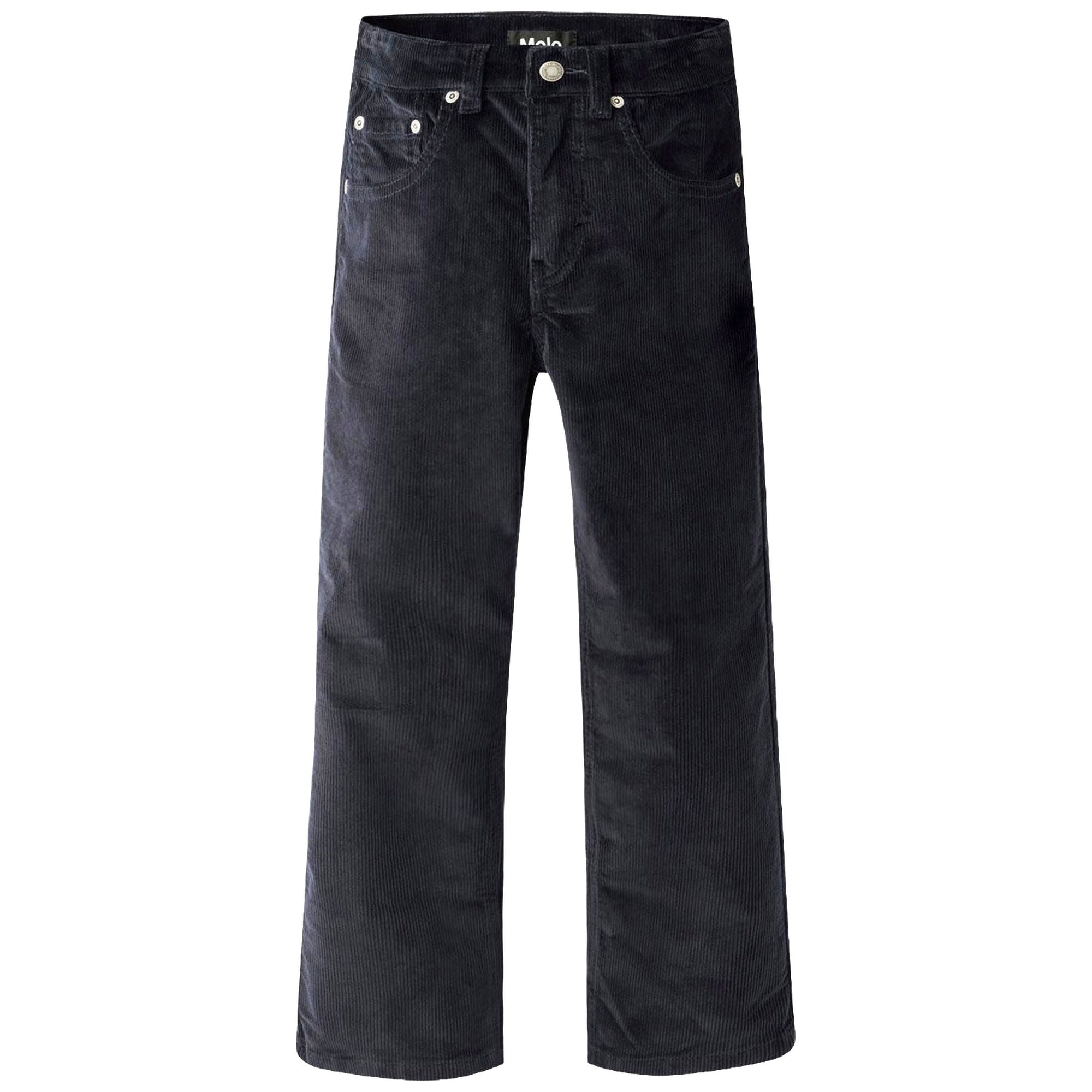 This Molo navy pants made of ribbed corduroy with five pockets, wide legs and zip fly. The pants are inspired by the skateboarding scene and have a relaxed, loose fit.