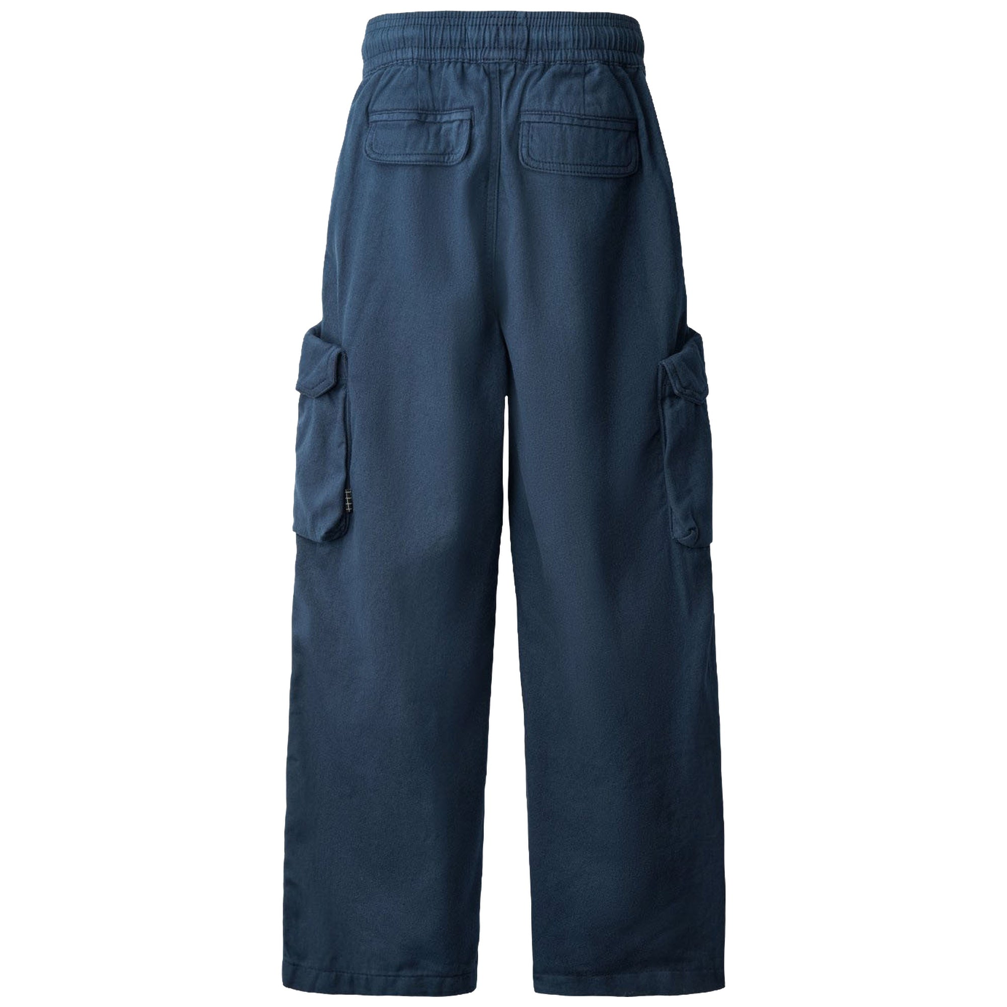 This Molo relaxed navy cargo pants featuring a comfortable drawstring waist, a wide-leg fit, and two large, practical side pockets for storage.