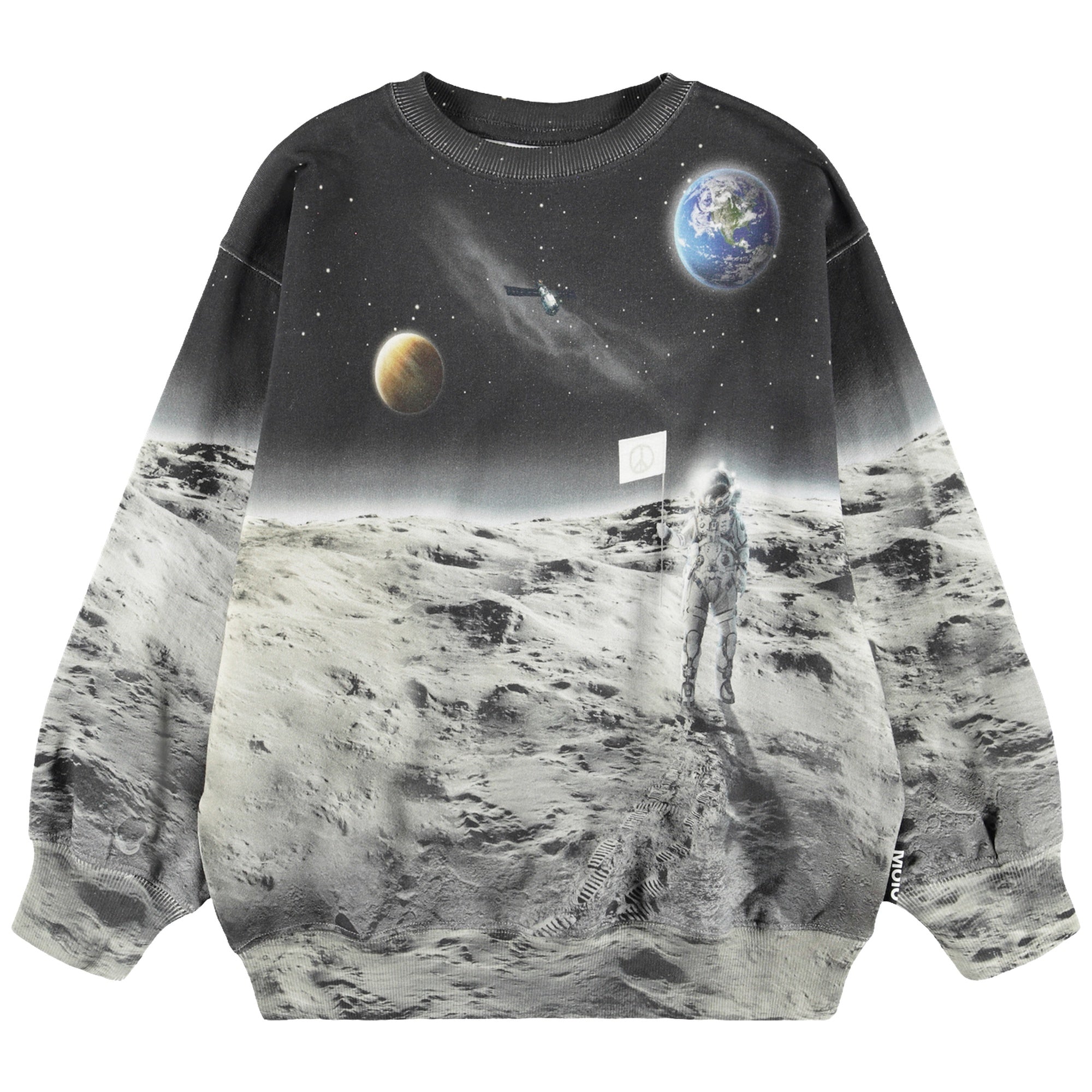 This Molo bold sweatshirt featuring an astronaut standing on the Moon's surface with Earth and planets visible in the starry, galaxy-printed sky.