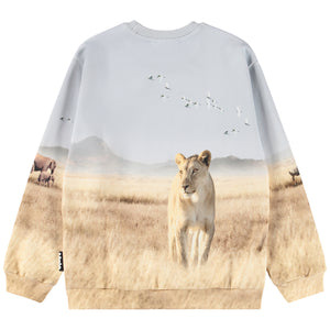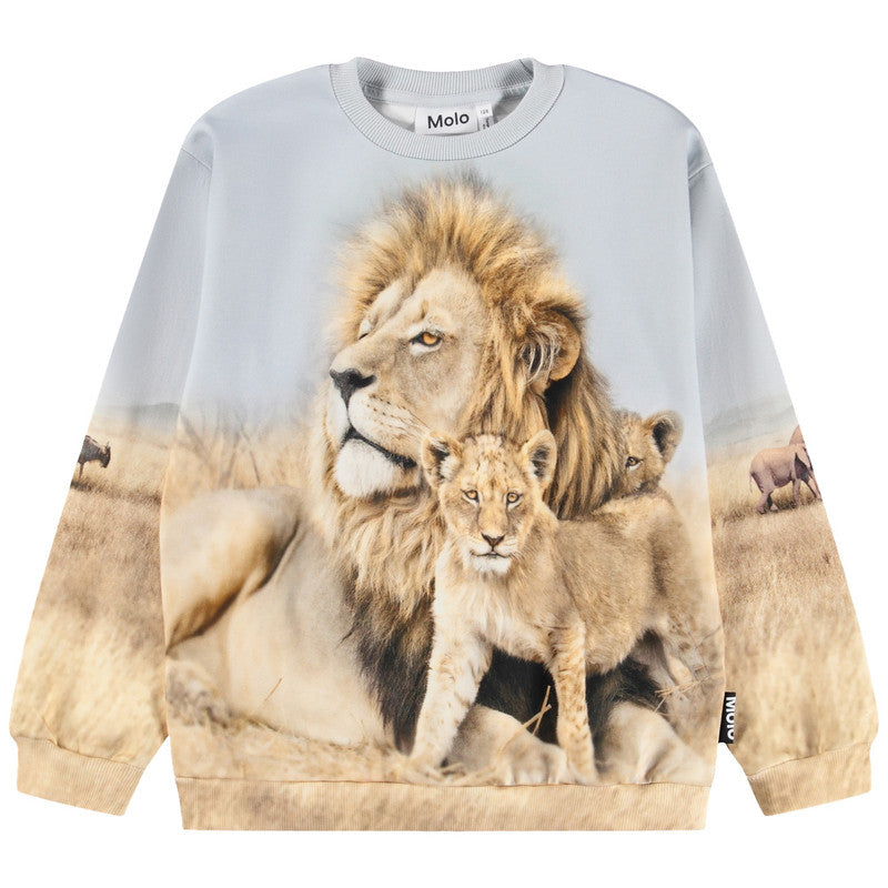 This Molo Cozy sweatshirt with a stunning photorealistic print of a proud adult lion and two cubs resting in the golden African savanna.