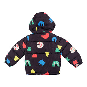 Black Jacket with all over Alphabet print for boys from Stella McCartney. The lining of the jacket is soft, pleasant to the touch black fur. The jacket is equipped with a detachable, insulated hood and zipped pockets. The bottom of the sleeve with adjustable velcro width.