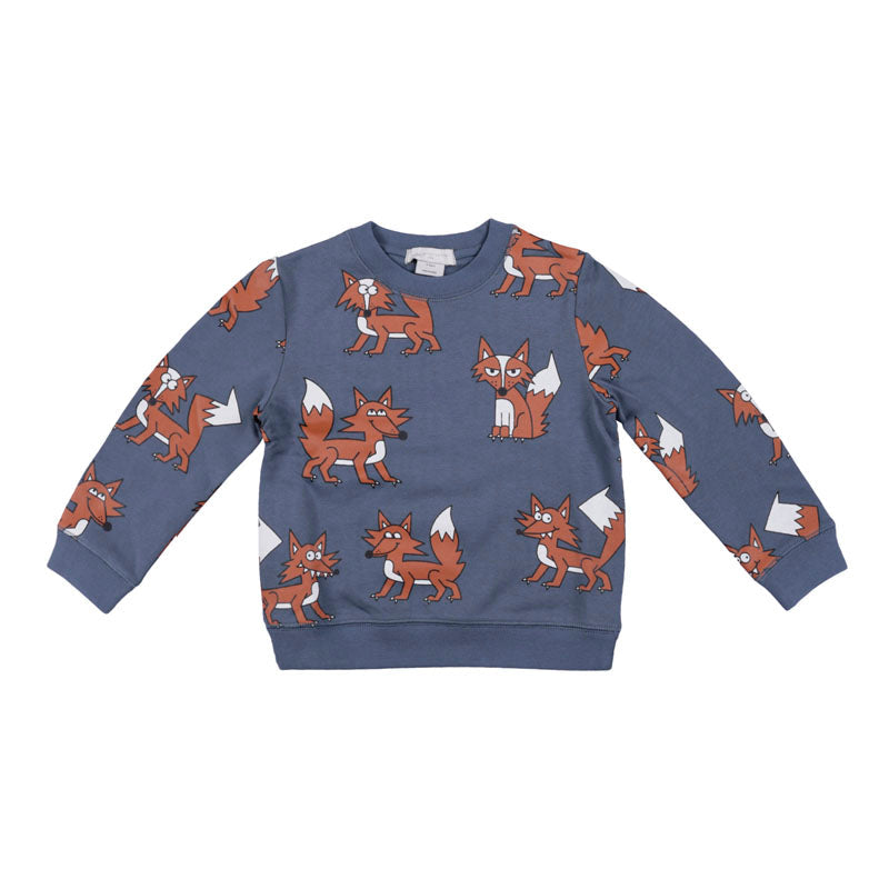 Funky blue tracksuit for boys from Stella McCartney Kids, made in soft organic cotton jersey. Both pieces are printed with playful foxes and have fleecy insides for added warmth. The joggers have an elasticated waist which can be adjusted for a better fit via drawstring.