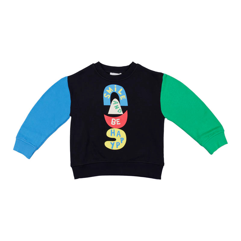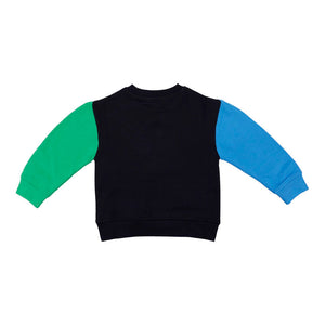 Black colourblock sweatshirt for boys by Stella McCartney Kids, made in organic cotton jersey. Cosy and comfortable to wear, it has an inspiring slogan print on the front with bright blue and green colourblock sleeves. Soft with a fleecy inside, it has dropped shoulders and gently ribbed trims for casual wear.