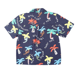From Stella McCartney Kids, a black shirt for boys with a colourful palm tree and slogan print. Made in lightweight organic cotton poplin, it has a revere collar and a patch pocket on the chest. The Stella McCartney fit can be quite small so choose a size up if you want room to grow.