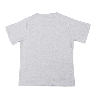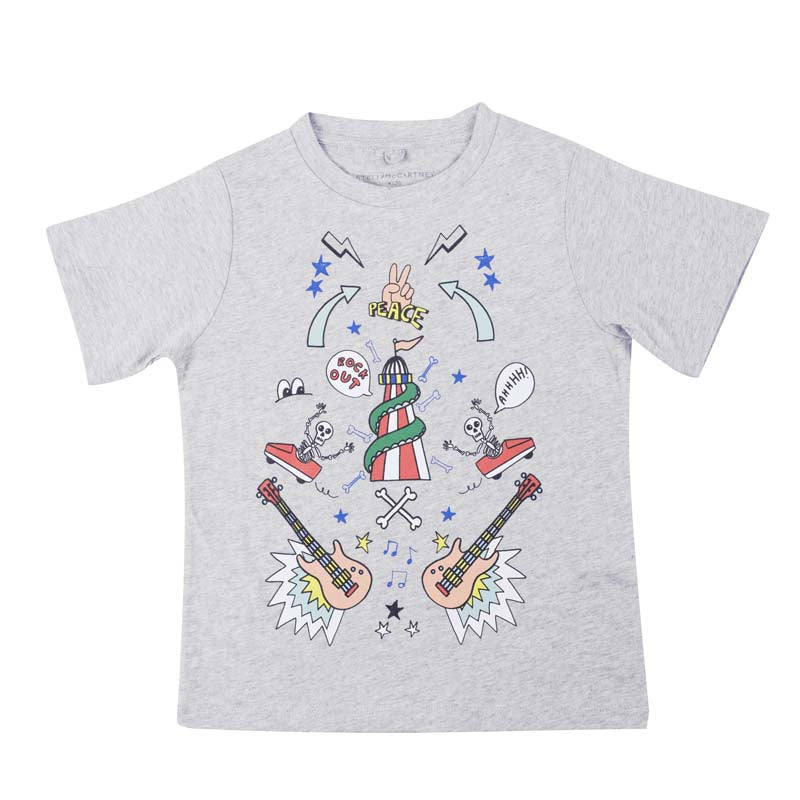 Fun grey t-shirt for boys from Stella McCartney Kids, made in organic cotton. It has brightly coloured funfair inspired prints and appliqués on the front for a quirky finish. The Stella McCartney fit can be quite small so choose a size up if you want room to grow.