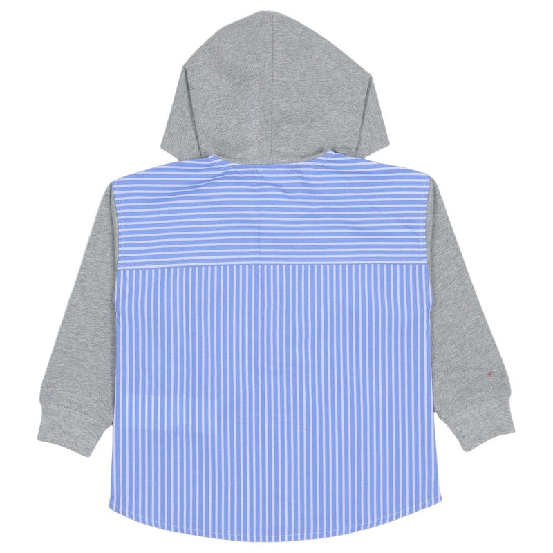 This Moschino Kids Hooded Shirt In Cornflower Blue Features A Playful Teddy Print. Designed With Long Sleeves, Ribbed Cuffs, And A Front Button Fastening, It Blends Casual Comfort With A Fun, Stylish Touch.