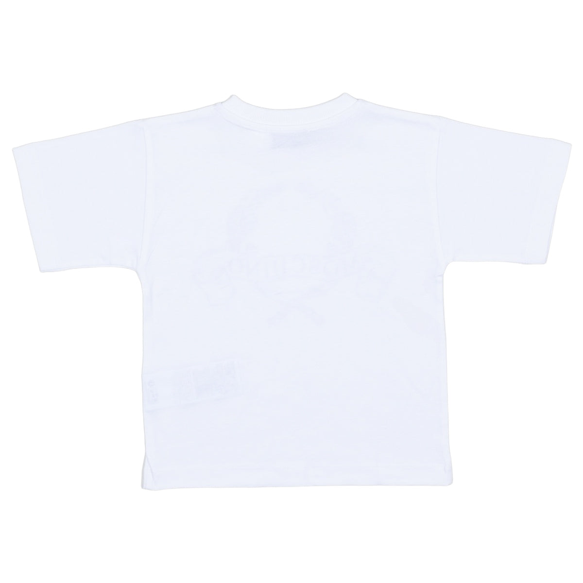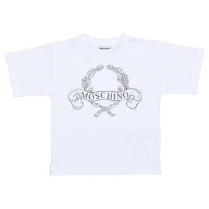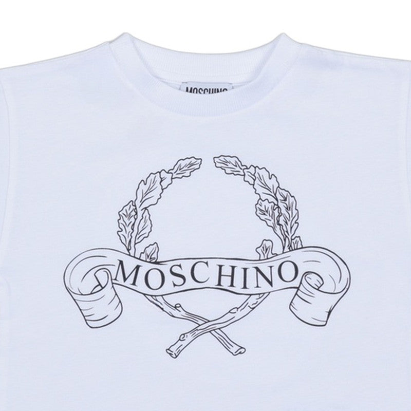 This Bold White T-Shirt From Moschino Is A Classic And Comfortable Piece For Any Child'S Wardrobe. Made From Soft Cotton, It Features A Striking Black Wreath And Ribbon Logo Print Across The Chest. The Wide Crew Neck And Short Sleeves Offer A Relaxed Fit, Making It Perfect For Everyday Wear.
