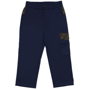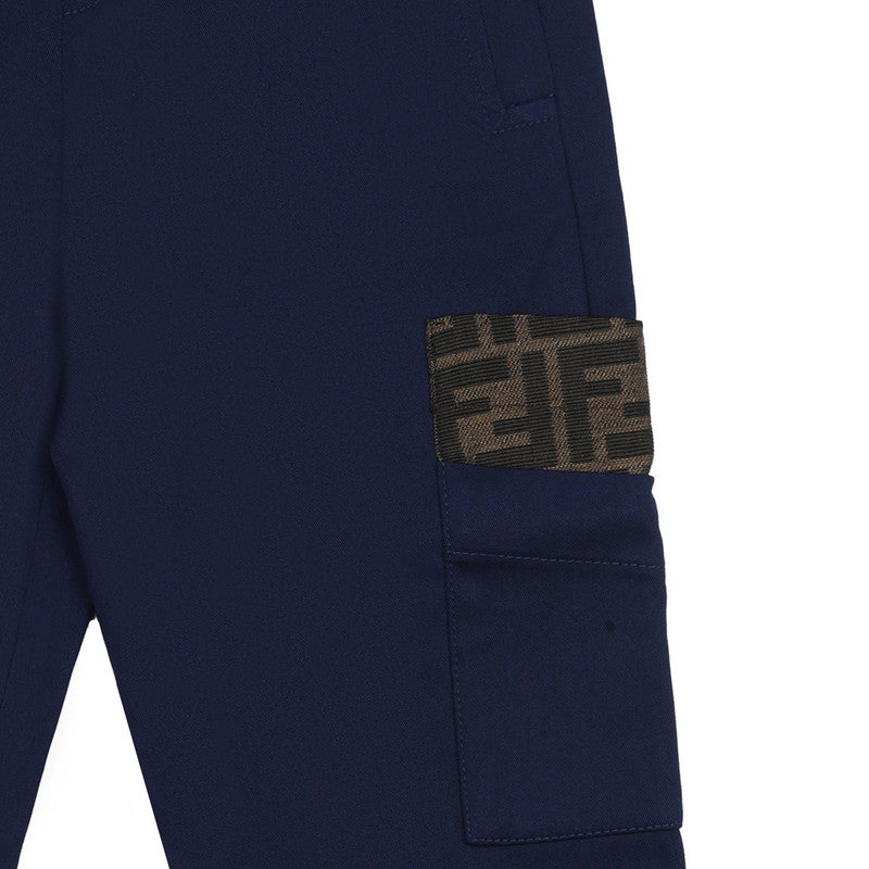 These navy blue Fendi trousers feature a concealed fly, rear elasticated waistband, and belt loops. The design is finished with iconic FF logo-patterned panels and two side welt pockets.