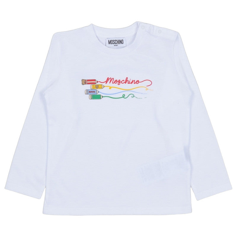 This Crisp White Long-Sleeve Top From Moschino Kids Is A Creative And Playful Addition To Any Child'S Wardrobe. The Front Features A Unique Pencil Print That Showcases The Signature Teddy Bear Motif And "Moschino" Graphic Lettering. With A Comfortable Crew Neck And Soft Material, This Top Is Perfect For School Days Or Weekend Adventures.