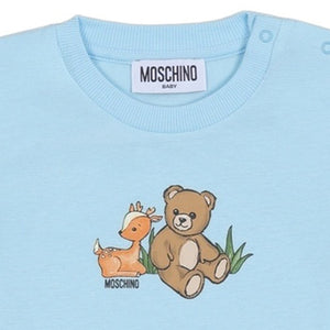 This Charming Light Blue Long-Sleeve T-Shirt From Moschino Kids Is A Sweet And Comfortable Addition To Any Wardrobe. Made From A Soft Cotton Blend, It Features A Playful Graphic Of The Brand'S Signature Teddy Bear Sitting Beside A Deer. The Classic Crew Neck And Long Sleeves Make It Perfect For Layering, While The Snap-Button Closure On The Shoulder Ensures Easy Dressing.