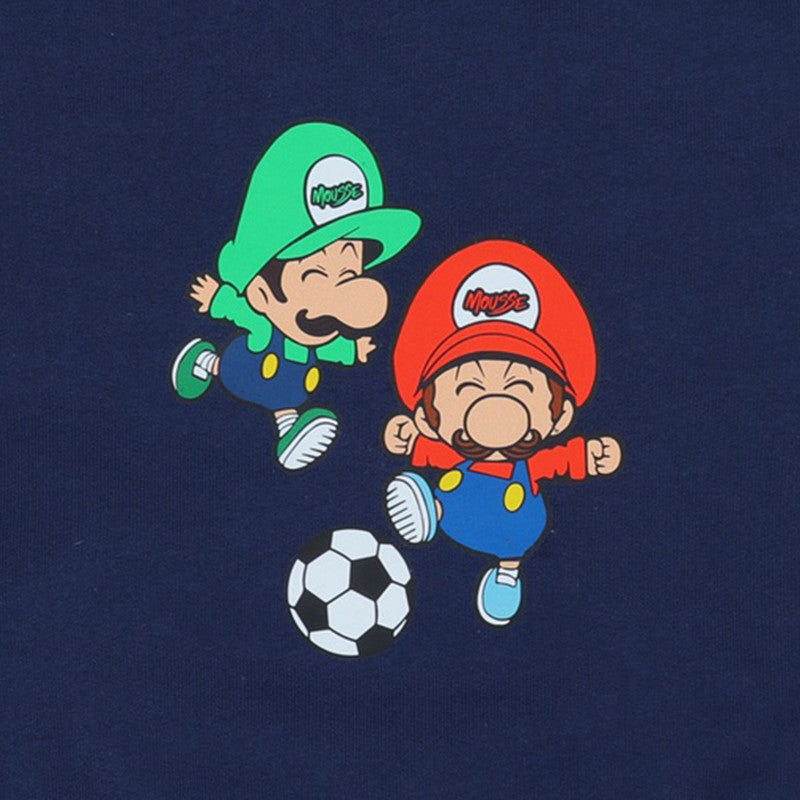 Score style points with this Mousse navy blue sweatshirt! It features a playful graphic of two iconic characters playing soccer, perfect for little champions on and off the field.