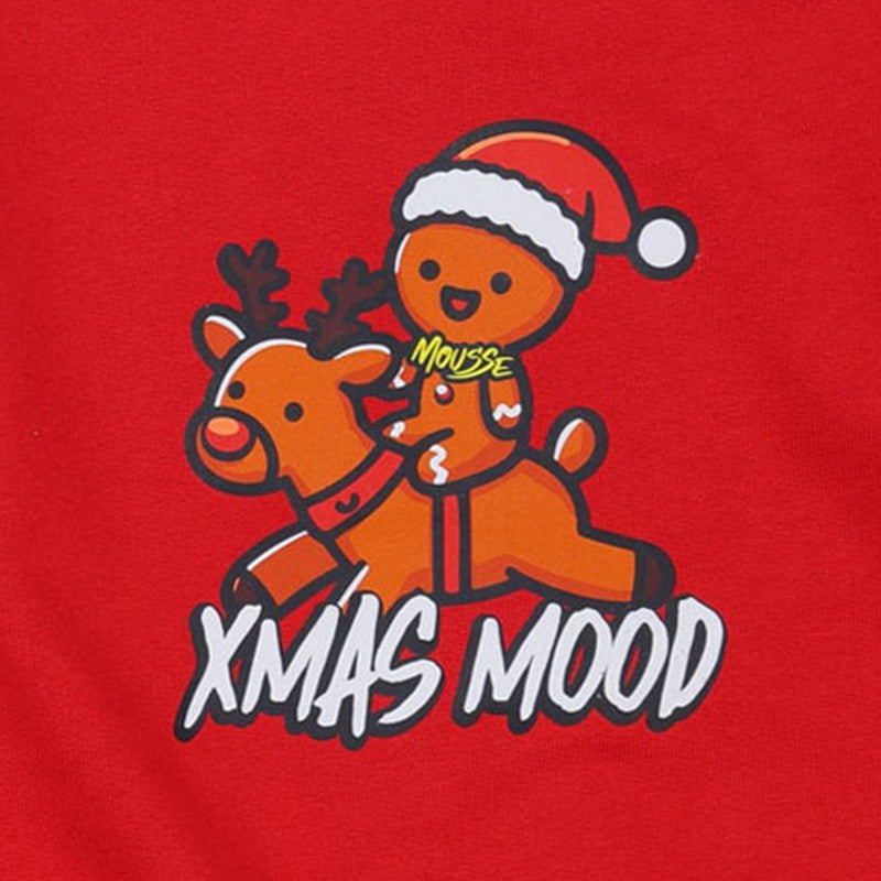 Embrace the holidays with this fun Mousse red sweatshirt! Featuring a gingerbread man riding a reindeer and "XMAS MOOD," it's the sweetest way to stay cozy this season.