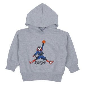 Keep them cozy while they soar to new heights! This Mousse grey hoodie features a dynamic hero graphic making a slam dunk, perfect for athletic style and warmth.