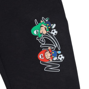 Score comfort points with these Mousse Black Mario Soccer Joggers! Featuring a fun side graphic of Mario and Luigi playing ball, these cozy pants are ready for high-action playtime.