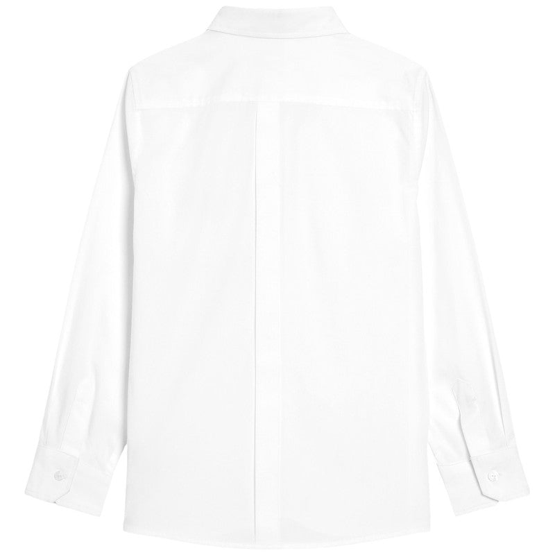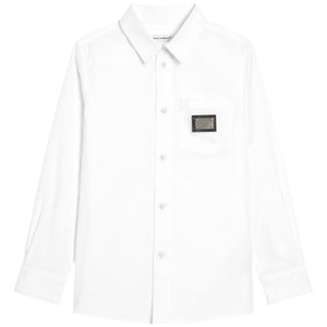 This classic white Dolce & Gabbana shirt is elevated by a metal logo plaque on the chest pocket. Made from crisp cotton, it’s a versatile and stylish piece for formal or casual looks.