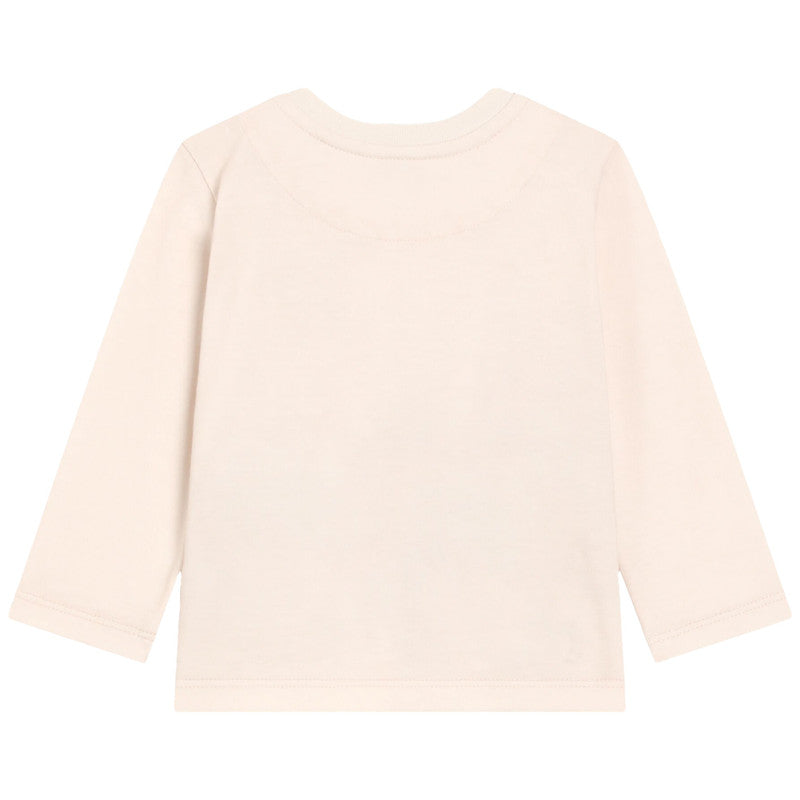 Adorable beige long-sleeved cotton T-shirt by luxury Italian brand, Dolce & Gabbana. It has the iconic DG logo on the chest and a delightful baby leopard graphic with super cute 3D ears and embroidered features. Made in soft jersey, it has useful poppers on one shoulder to help with dressing.