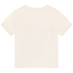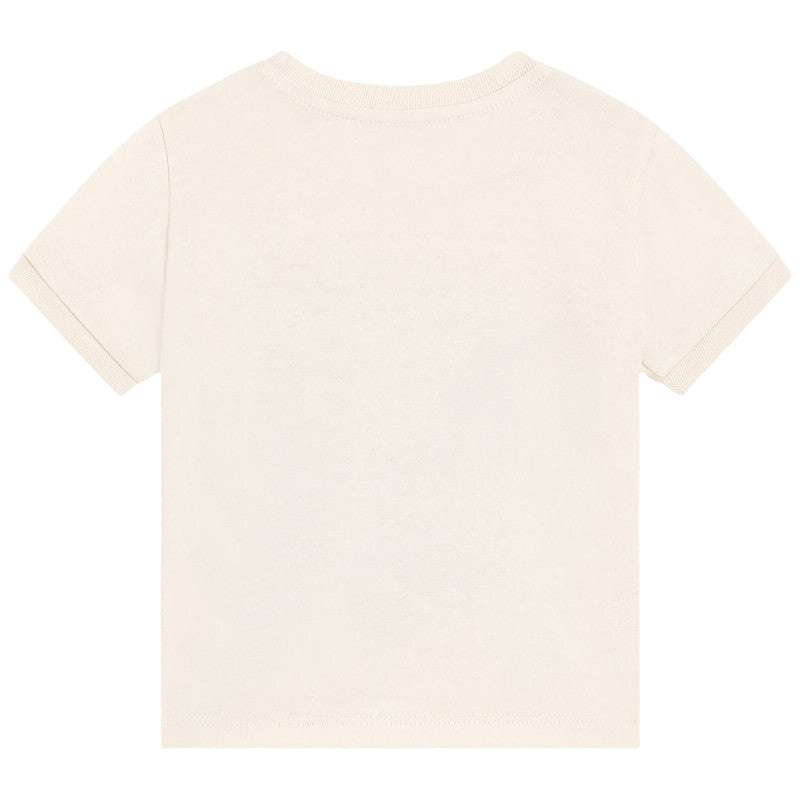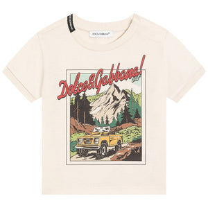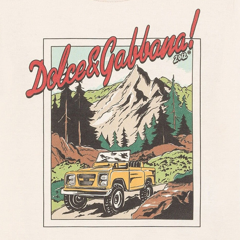 A cream cotton T-shirt by luxury Italian label, Dolce & Gabbana. Calling budding explorers in the making, this cool tee features a vintage graphic of a mountain scene and a statement logo. It is made in soft and comfortable jersey, with a little logo tab on the classic crew neckline.