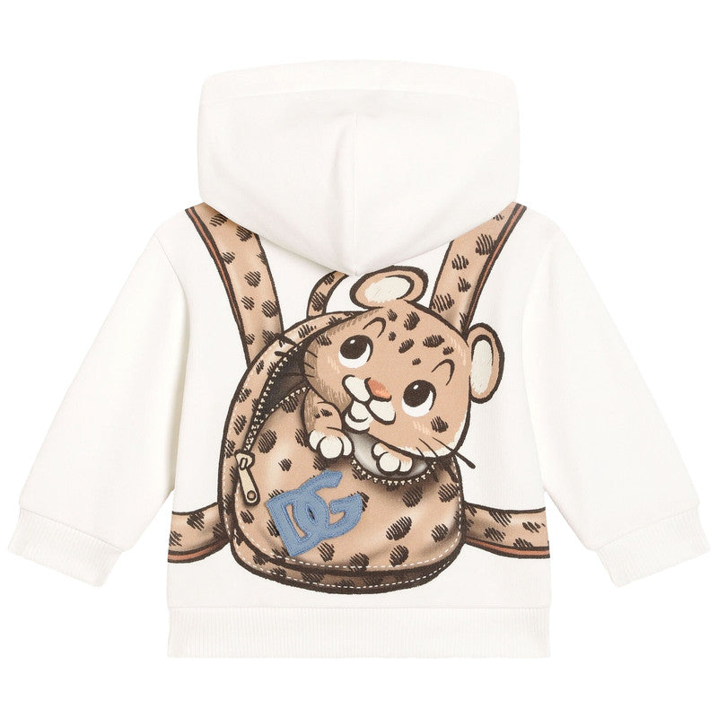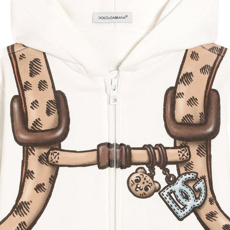 This fun, ivory zip-up top by luxury label Dolce & Gabbana, features a beige backpack graphic print and distinctive DG logos. Ideal for comfortable casual wear, it is made in soft cotton jersey, with a full zip fastening and stretchy ribbed trims. A cute little leopard cub sits in the backpack for a playful finishing touch.