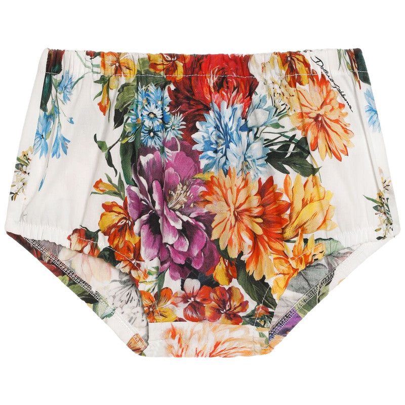 A charming off-white dress by luxury Italian label Dolce & Gabbana, made in smooth cotton poplin. It is patterned in a beautiful and colourful floral print, incorporating the brand's script logo for a subtle designer touch.