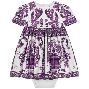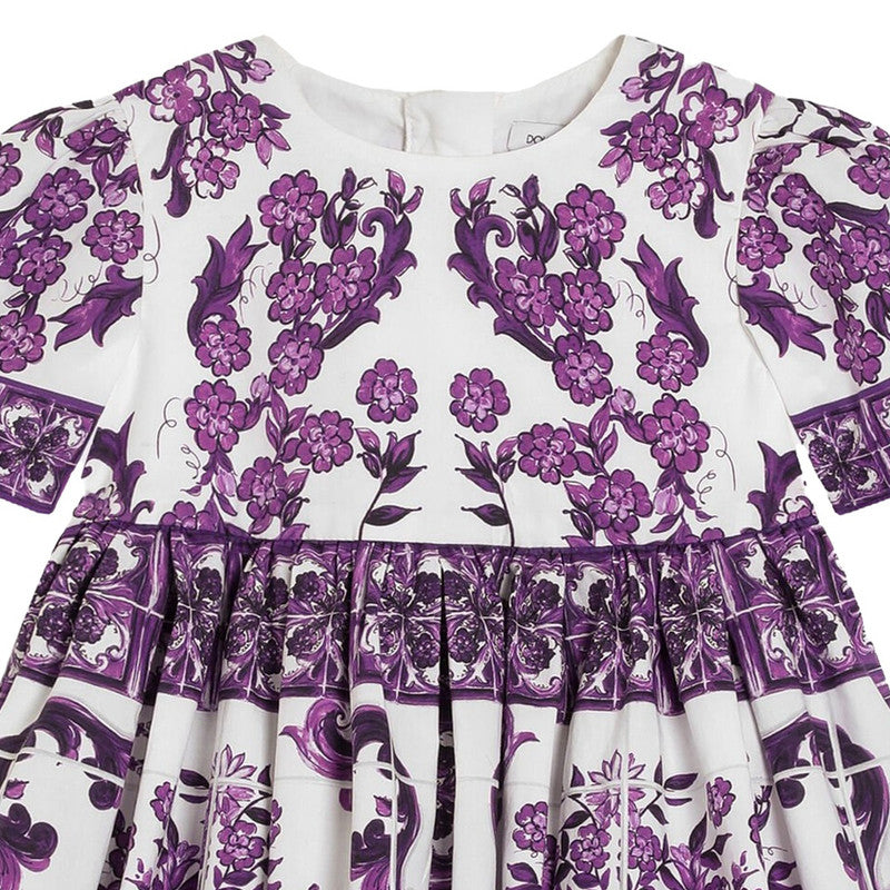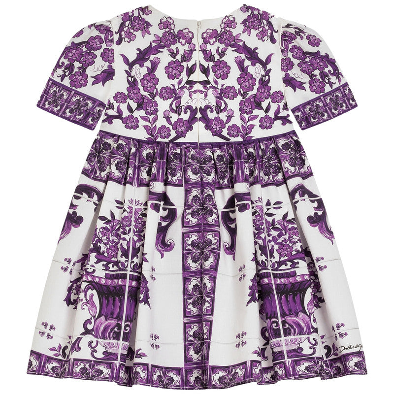 Charming dress by luxury Italian label Dolce & Gabbana, made in lightweight cotton poplin. This traditionally-styled dress is patterned with the Italian label's beautiful purple Majolica design on a white background.