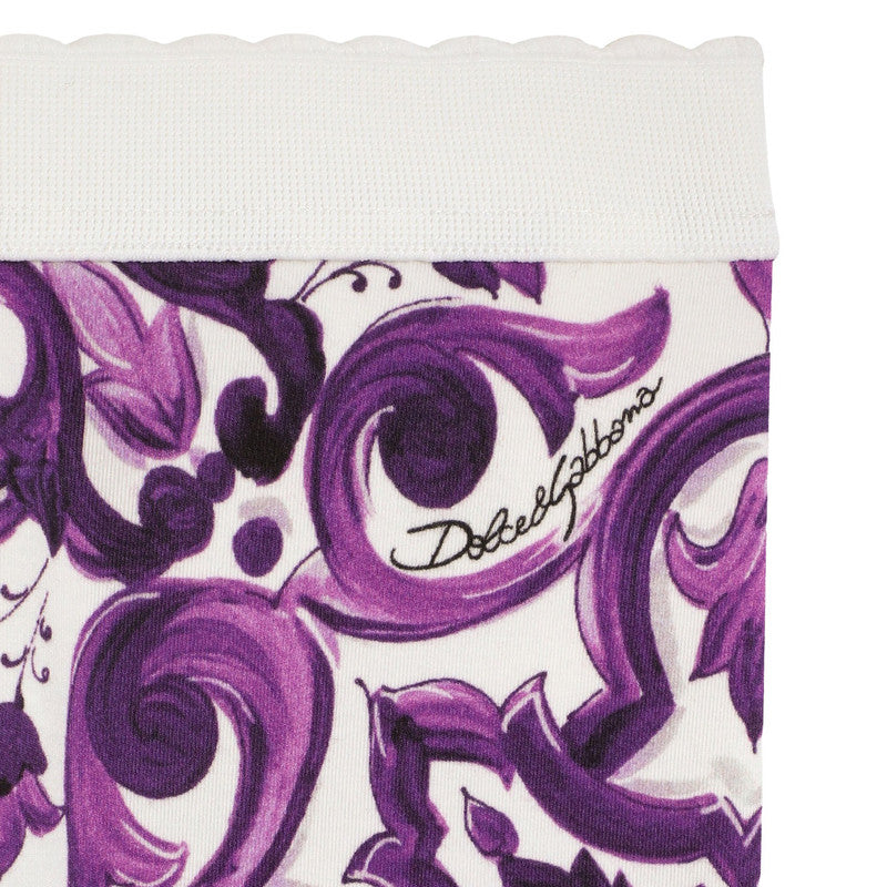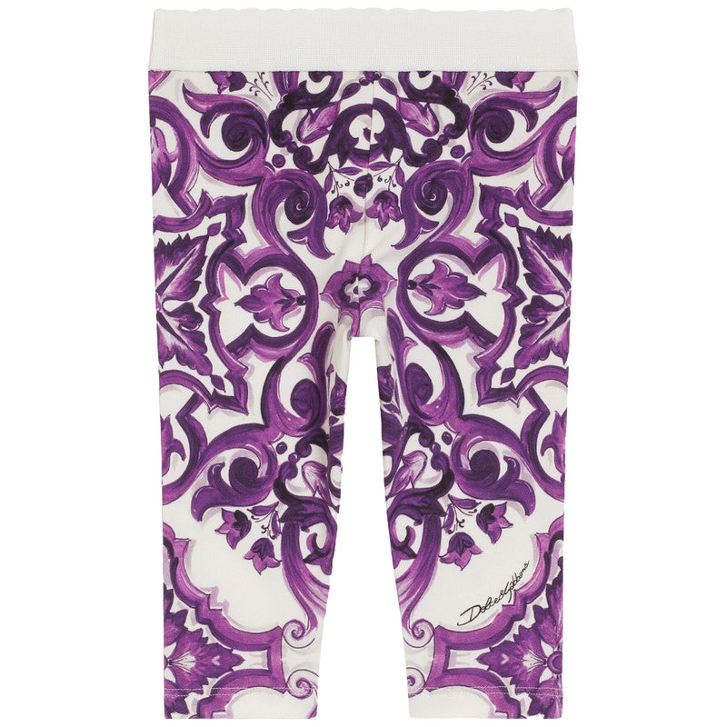 Pretty leggings by luxury Italian brand Dolce & Gabbana, made in beautifully soft cotton jersey. They feature the designer's signature Majolica pattern in vibrant purple on a white background. They offer both comfort and style with an elasticated waistband for easy wear.