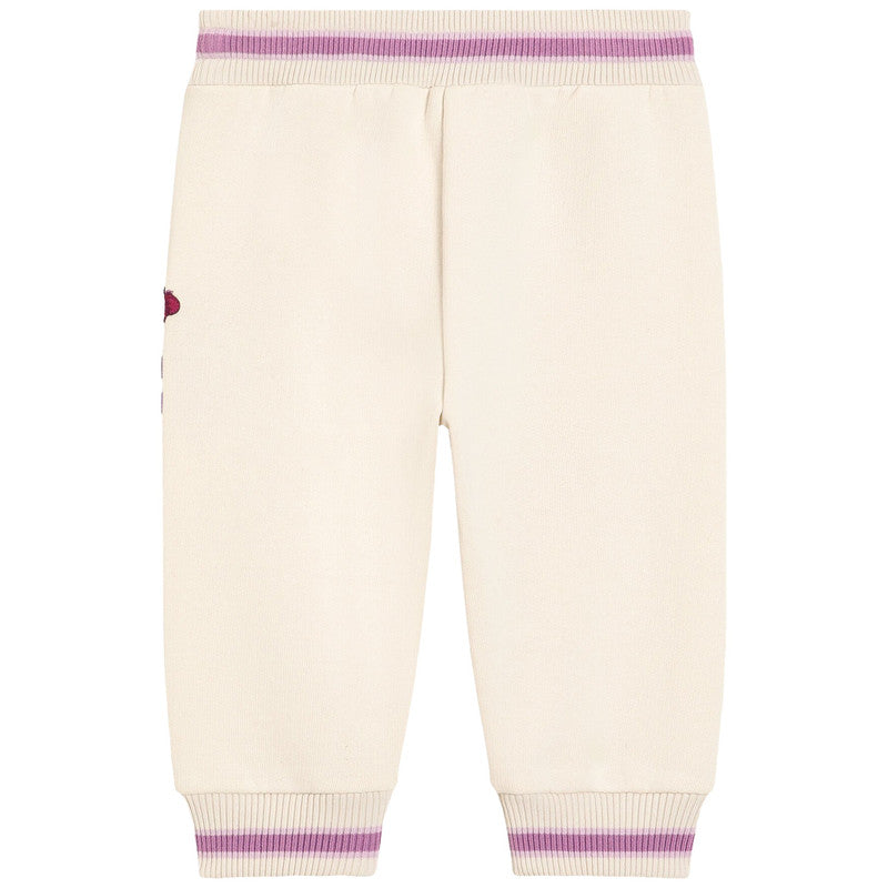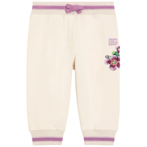 These ivory joggers by Dolce & Gabbana, combine comfort with a touch of elegance. Made in soft cotton jersey, they have side seam pockets and a cosy elasticated waistband. The purple and pink striped ribbed trims add a pop of colour, coordinating with the vibrant floral embroidery and DG logo on one leg.