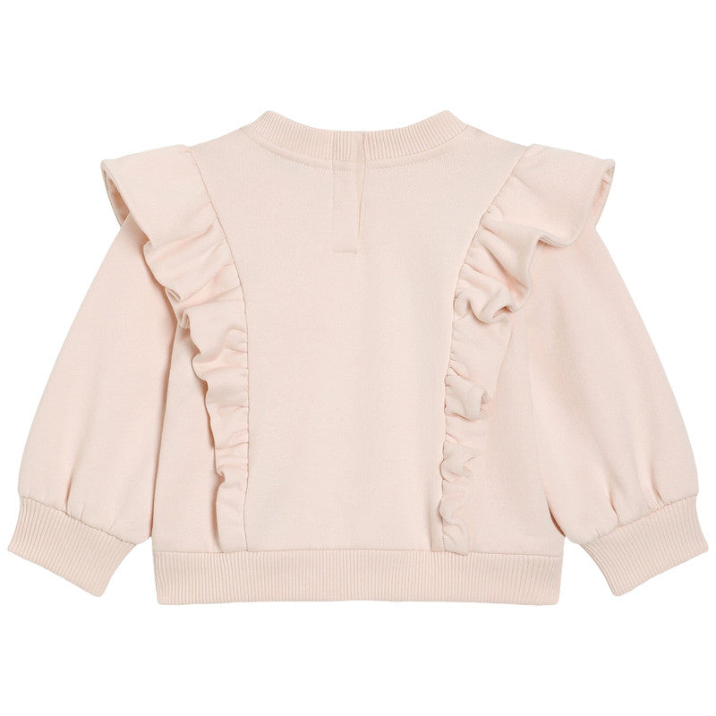 This light peach sweatshirt by luxury label Dolce & Gabbana effortlessly blends comfort and style. Made in soft cotton jersey, it features a modern boxy silhouette accented by pretty ruffle trims. A tonal logo is embroidered across the front for a subtle yet sophisticated designer finish.