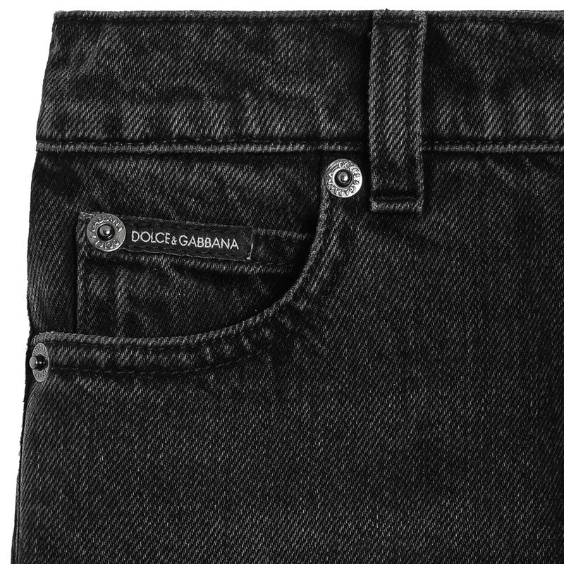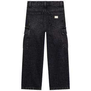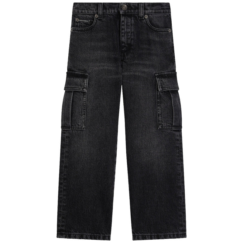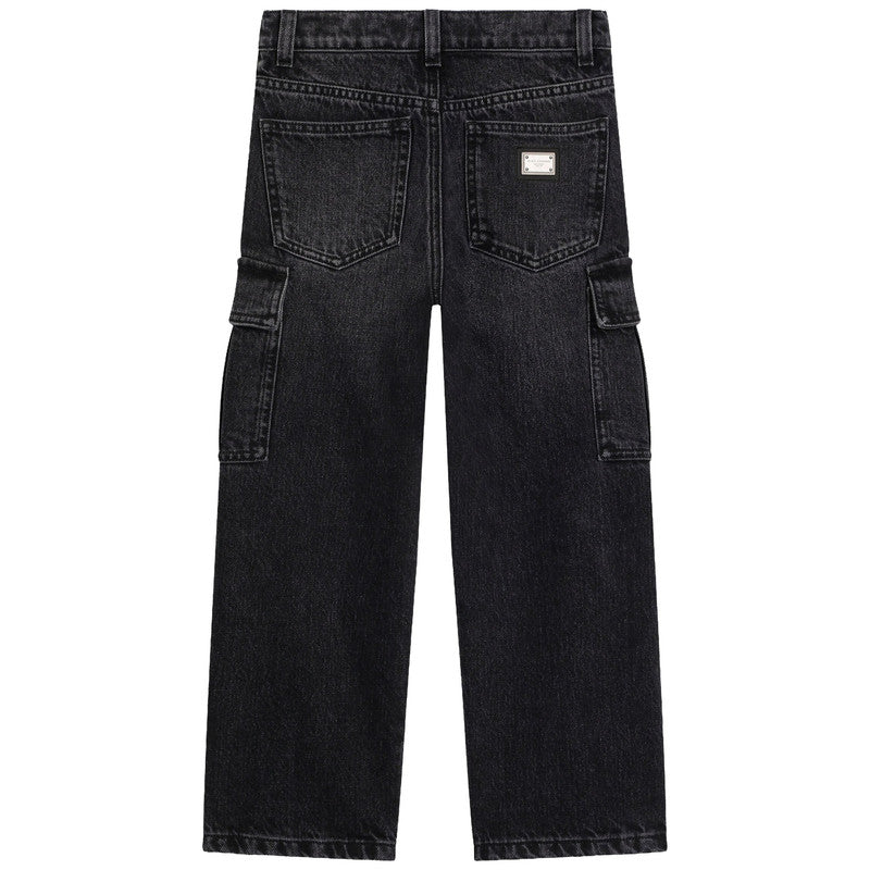 Dolce & Gabbana's washed black denim cargo pants blend edgy style with everyday comfort. Featuring practical cargo pockets, they're perfect for fashionable young explorers.