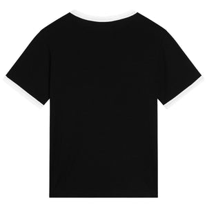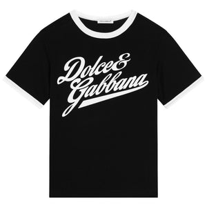 Black cotton T-shirt by Dolce & Gabbana, with a cool, flocked beige script-style logo. Casual yet stylish, this jersey tee has contrasting white trims and a classic crew neckline.