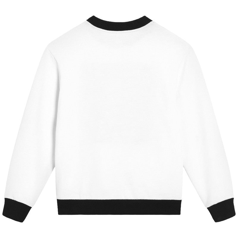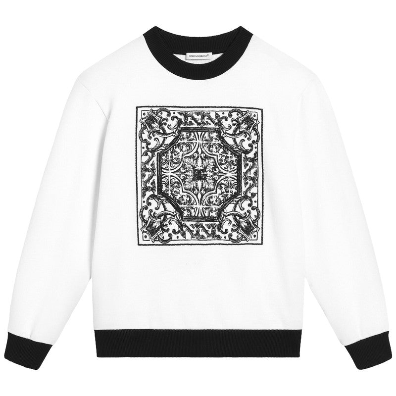 Black and white cotton sweatshirt by luxury brand, Dolce & Gabbana. The front features an intricately embroidered Majolica motif, a nod to the fashion house's Italian heritage. Made in soft, mid-weight jersey, this relaxed-fit top has black ribbed trims for a contrasting finish.