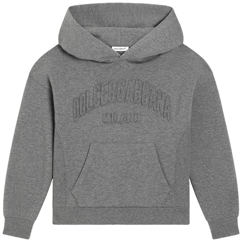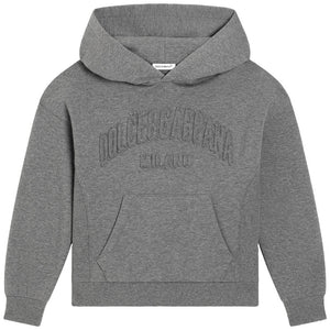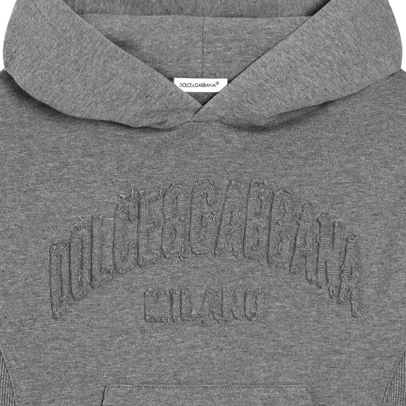 Wrap him up in sophisticated comfort with this Dolce & Gabbana grey pullover hoodie. It features an embroidered, tonal Dolce&Gabbana Milano arch logo and a classic kangaroo pocket, perfect for everyday style.