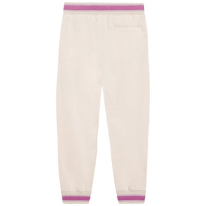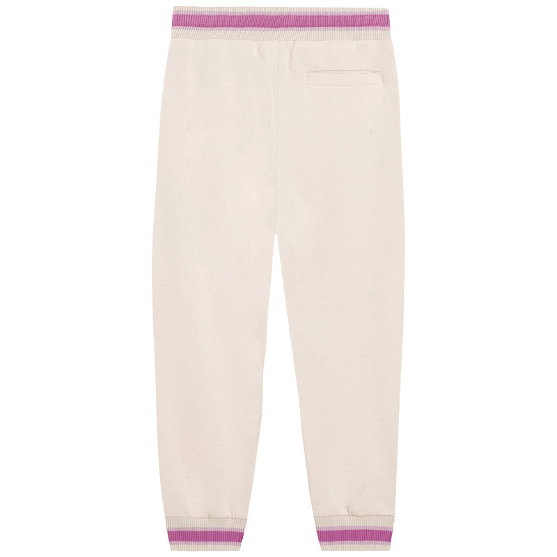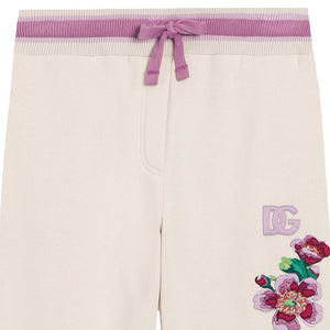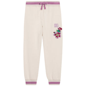 Ivory joggers for girls by Dolce & Gabbana offering a blend of comfort and style. Made in soft cotton jersey, they have side seam pockets and are trimmed in pink and purple, with a matching floral motif and embroidered DG logo on one side.