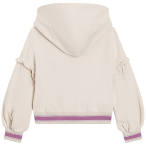 Effortlessly stylish in a casual look, this ivory hooded zip-up top for girls is from luxury Italian brand Dolce & Gabbana. Made in soft, loop-back cotton jersey, the chest features an exquisitely embroidered purple floral appliqué and the iconic DG logo. This comfortable layer is designed in a relaxed fit with dropped ruffle shoulders and contrasting lilac stripes.