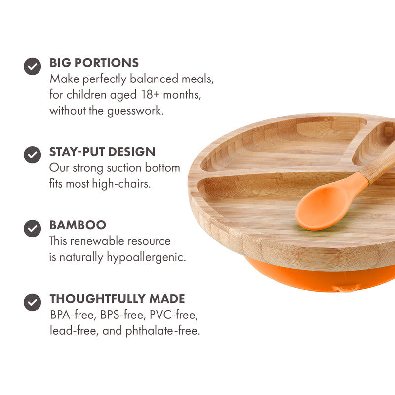 Our bamboo toddler plate and spoon set is perfect for growing kids with bigger appetites. The three compartments help you balance meals and control portions of wholesome, healthy food. Use the largest compartment for seasonal and green vegetables, the top left compartment for animal and plant proteins, and the top right compartment for healthy carbohydrates. The bamboo toddler plate is wider and taller than plates for younger ages, making it perfect for your growing baby.