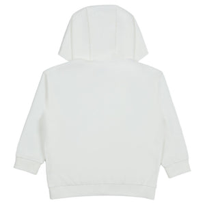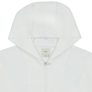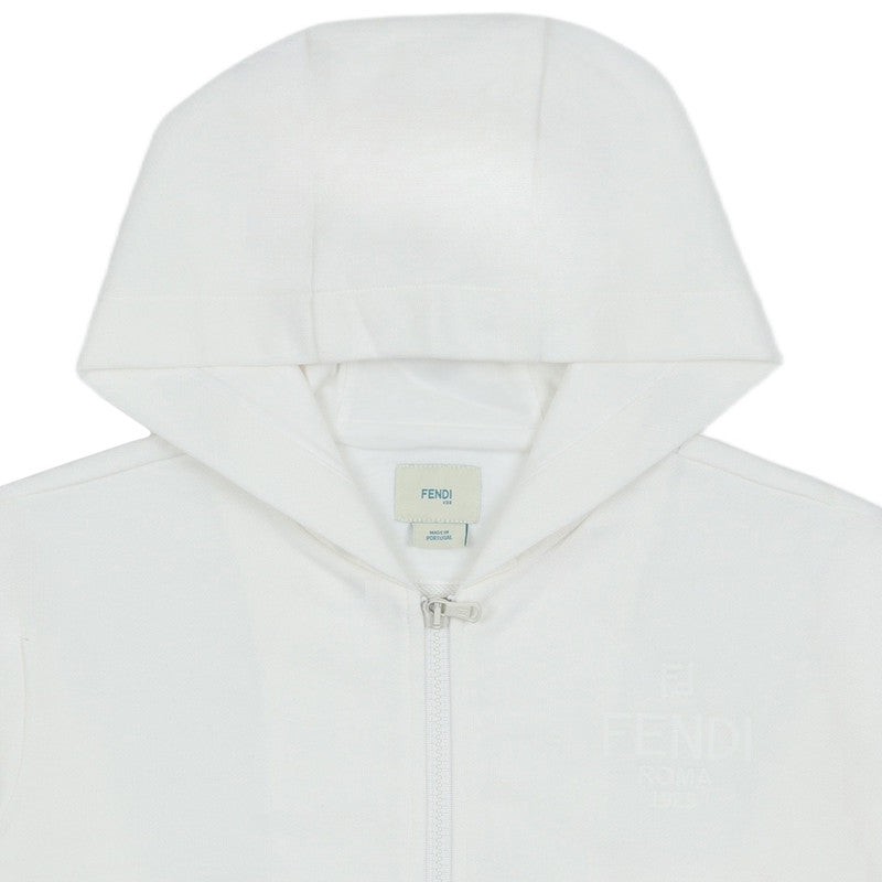 Classic white zip-up hoodie crafted for comfort, featuring a subtle, tone-on-tone embossed Fendi Roma logo on the chest.