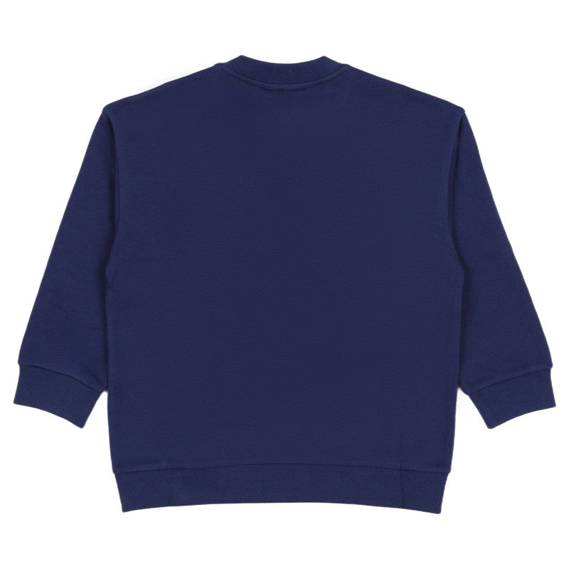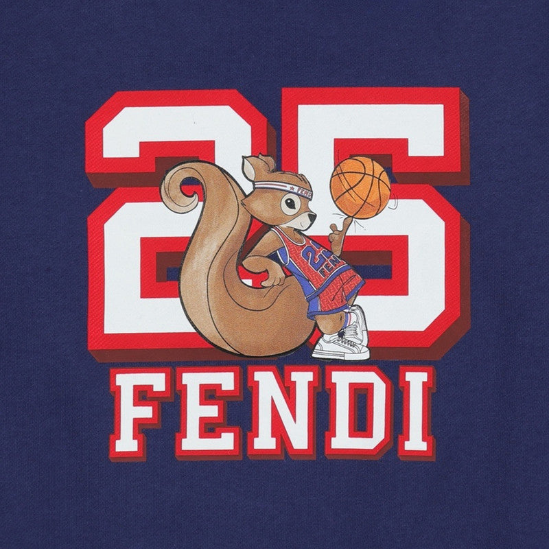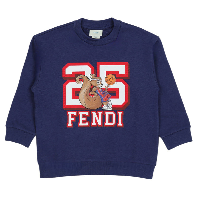 Navy blue cotton sweatshirt for boys by luxury Italian label Fendi, made in comfortable mid-weight jersey. This casual top features the brand's playful squirrel mascot on the front, with a bold logo and number 25 in red and white.