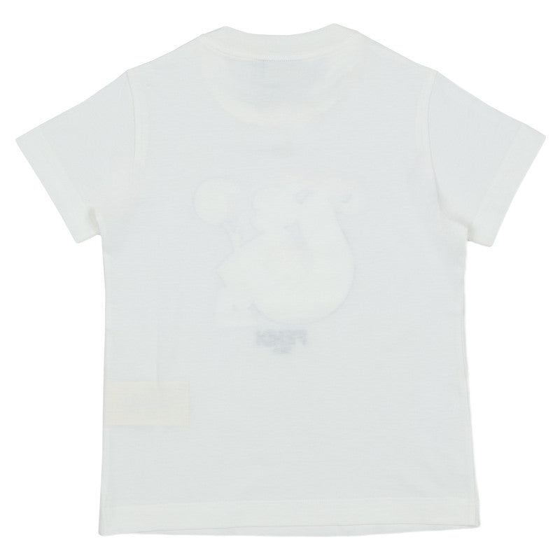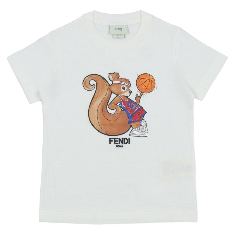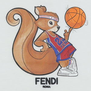 White cotton T-shirt by luxury Italian label Fendi, featuring a playful basketball squirrel motif on the front. Casual and comfortable, it is made in soft jersey with a classic crew neckline.