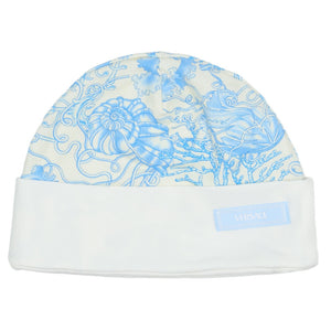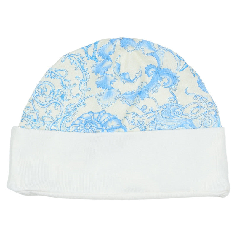 Dive into adorable luxury with this delightful baby footie and hat set. Featuring a serene blue and white oceanic print with sea creatures and corals, this soft sleepsuit has a classic collar and convenient snap fastenings. The matching beanie completes this cozy, designer ensemble for your little one.