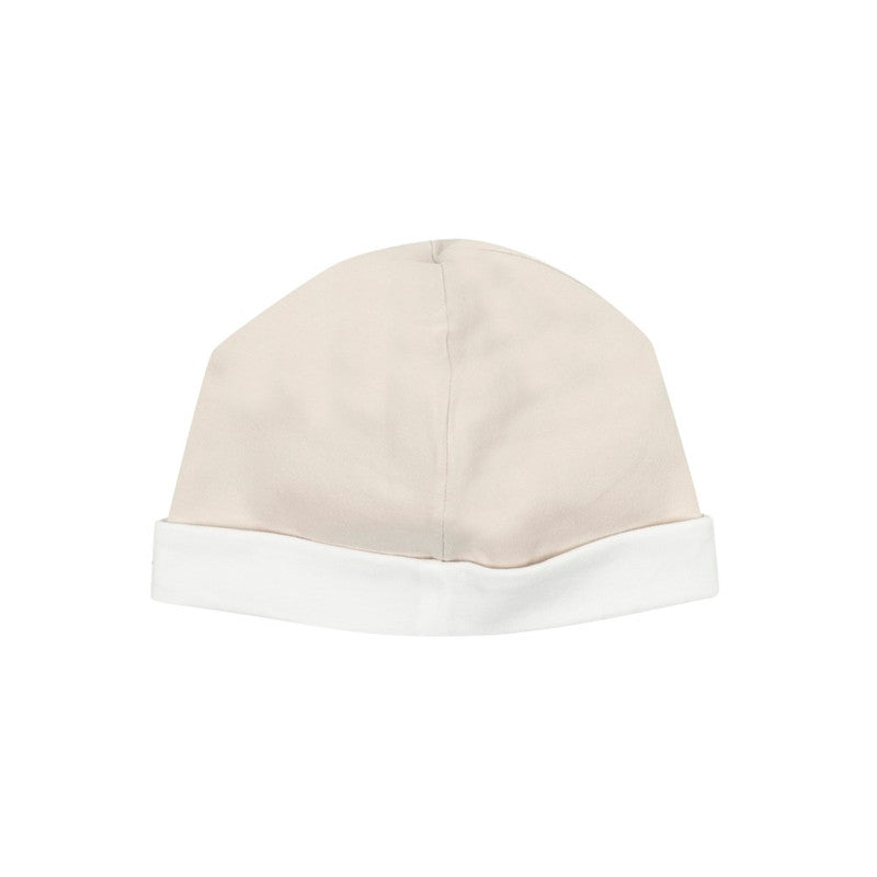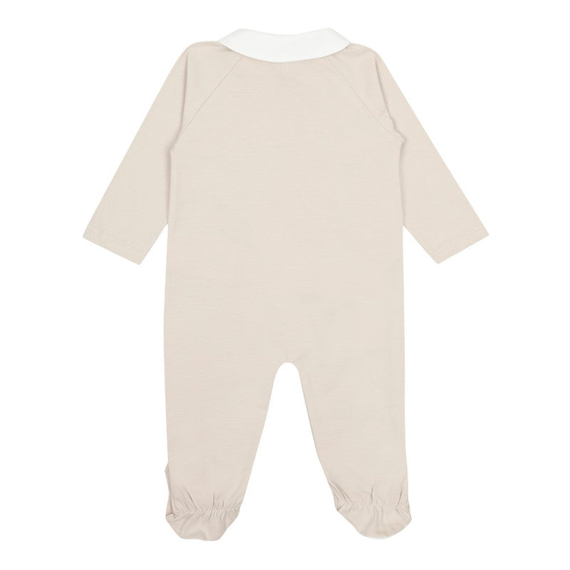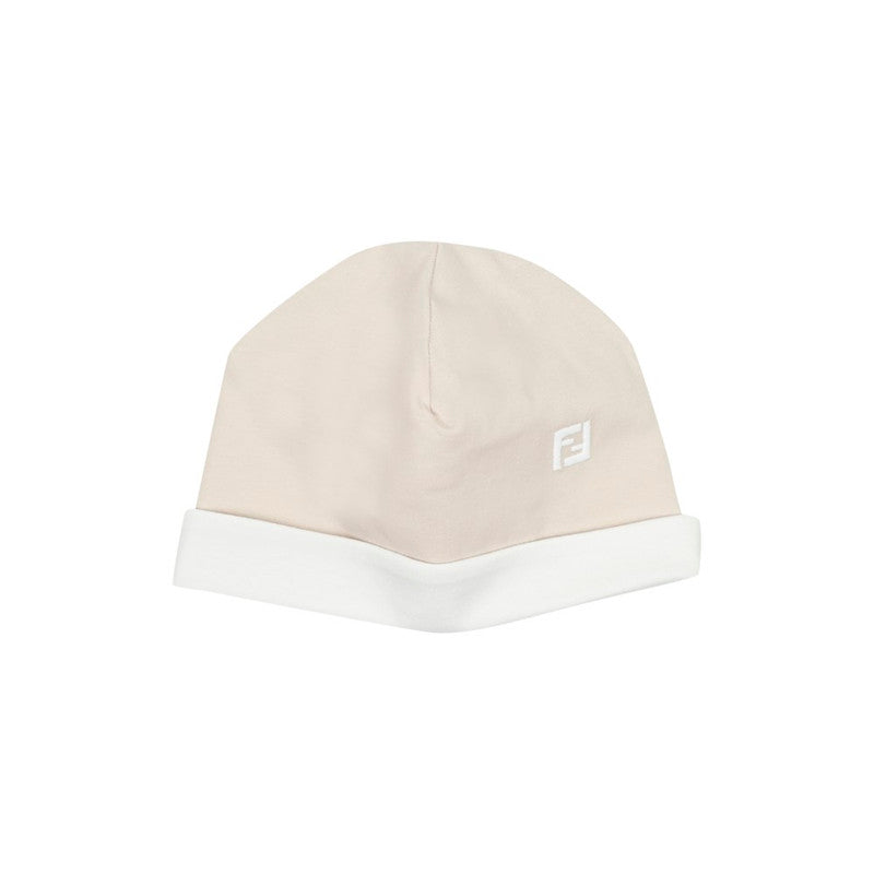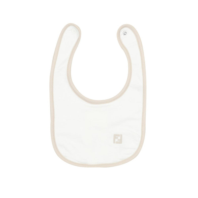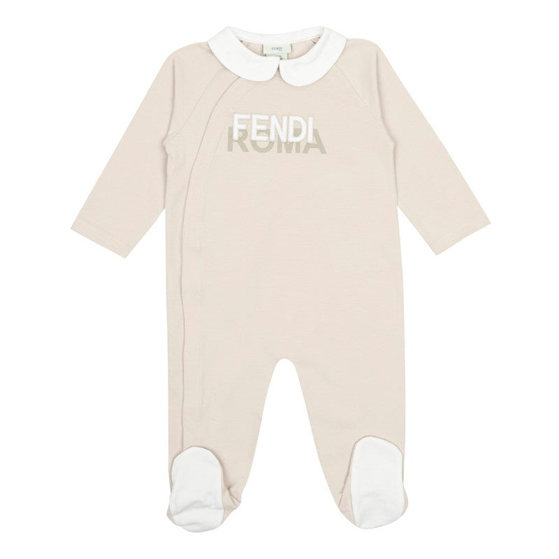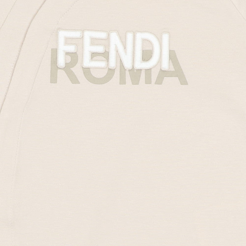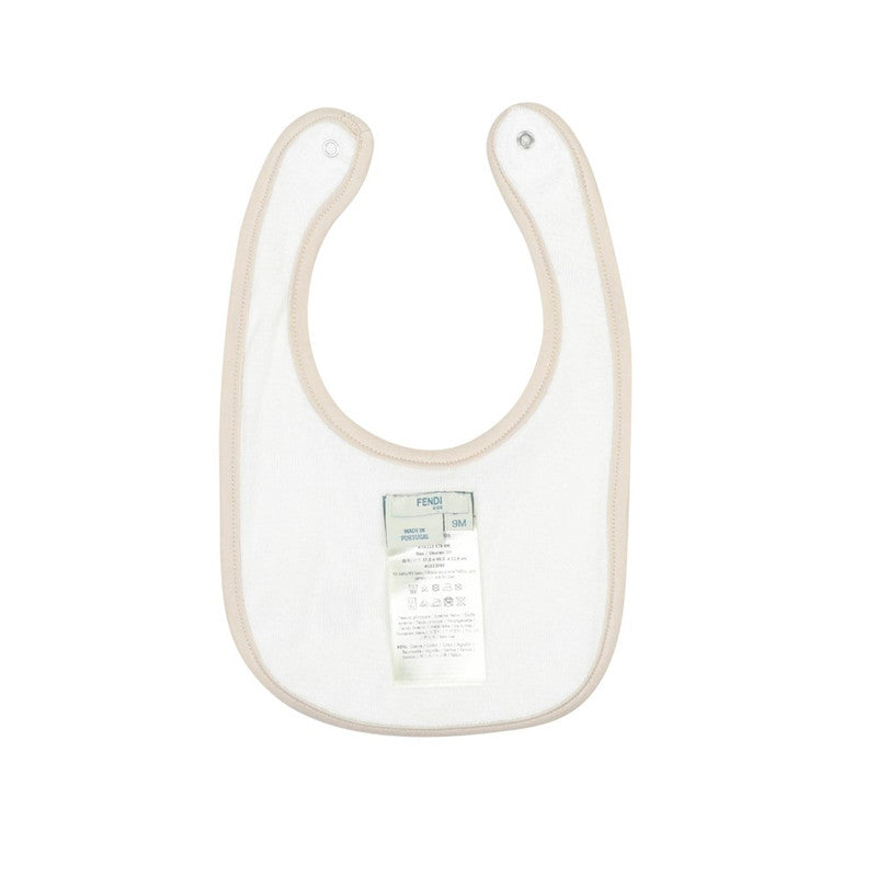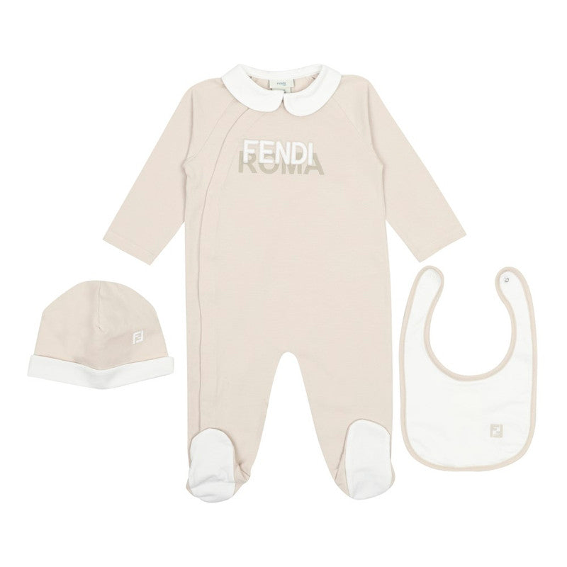 A charming beige and ivory babysuit set for boys and girls by brand, Fendi. Beautifully presented in a smart gift box, the set is made in super soft cotton jersey. The babygrow has an overlapping Fendi Roma logo embroidered and printed on the front, a Peter Pan collar, and concealed front popper fastenings. The coordinating hat and bib have the brand's embroidered signature FF logo. The bib fastens around the neck with a popper and has an absorbent towel lining.