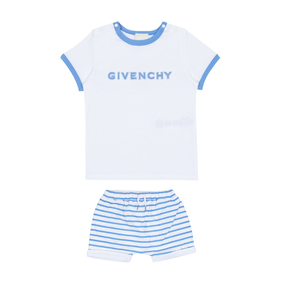A lovely white and pale blue shorts set for baby boys by Givenchy, made in the softest cotton jersey. Ideal for warmer days, the white, short-sleeved T-shirt has the designer's name appliquéd in pale blue on the front, with the iconic 4G logo on the back. It has matching pale blue trims and poppers on the shoulders to help with dressing. Fully lined for comfort, the striped shorts have sweet turned-up cuffs, side seam pockets and a decorative drawstring tie on the gently elasticated waistband. Presented in a branded box, it would make a lovely gift.