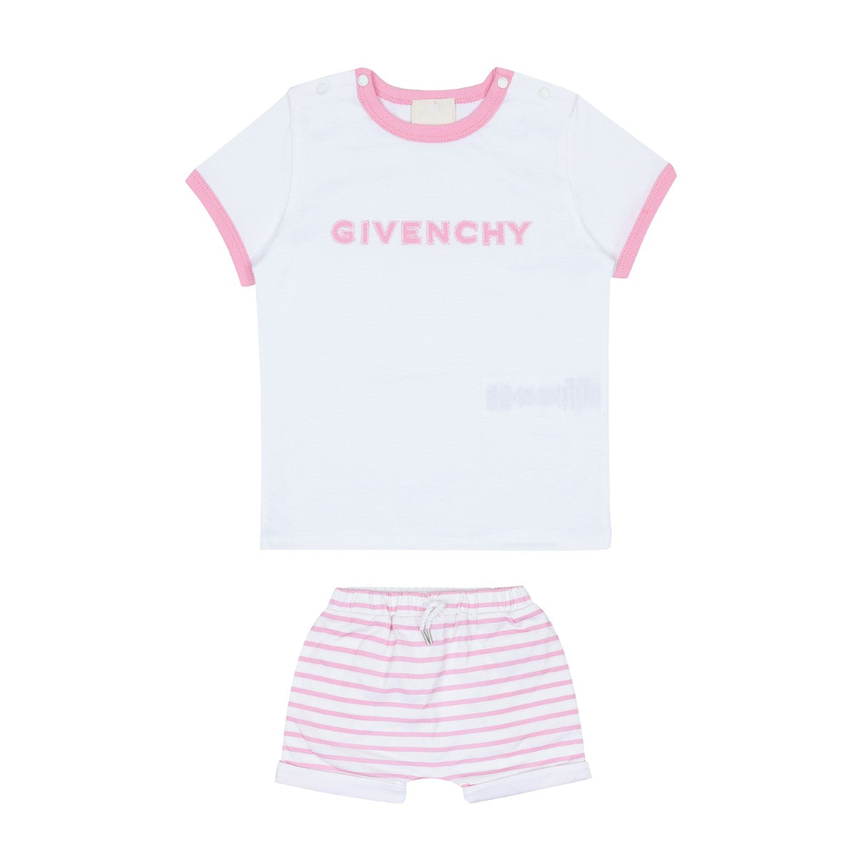 A lovely white and pink shorts set for baby girls by Givenchy, made in the softest cotton jersey. Ideal for warmer days, the white, short-sleeved T-shirt has the designer's name appliquéd in pink on the front, with the iconic 4G logo on the back. It has matching pink trims and poppers on both shoulders to help with dressing. Fully lined for comfort, the striped shorts have sweet turned-up cuffs, side seam pockets and a decorative drawstring tie on the gently elasticated waistband. Presented in a branded box, it would make a lovely gift.