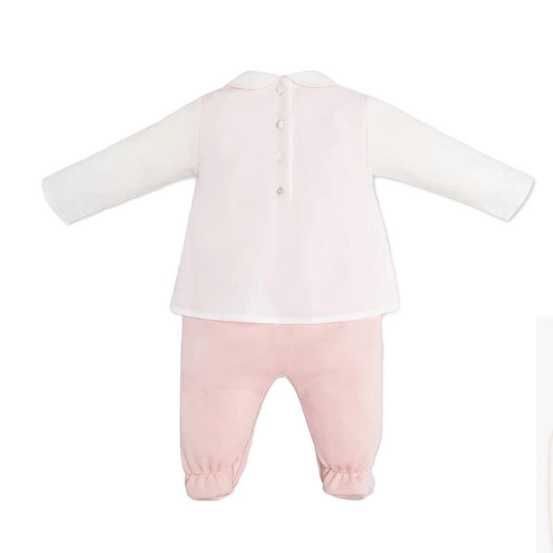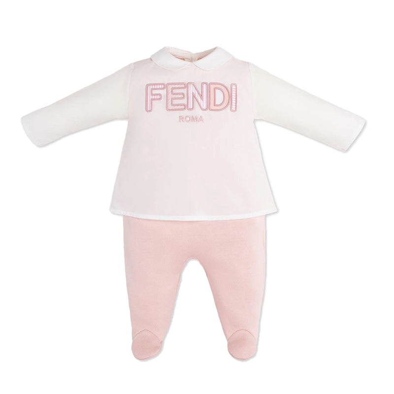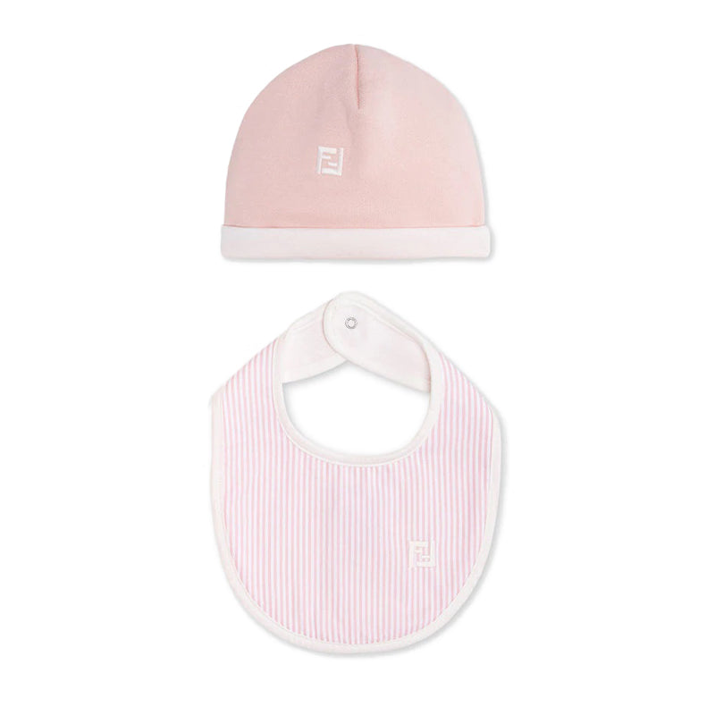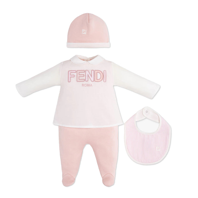 Baby kit consisting of a pink jersey and white poplin playsuit with patchwork Fendi lettering. Hat and bib in pink jersey with FF embroidery.