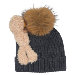 Cosy grey pom-pom hat by Monnalisa, made from soft, ribbed knitted wool, providing warmth and comfort during chilly days. The charming teddy bear design adds a touch of fun, while the fold-over brim ensures a snug fit.