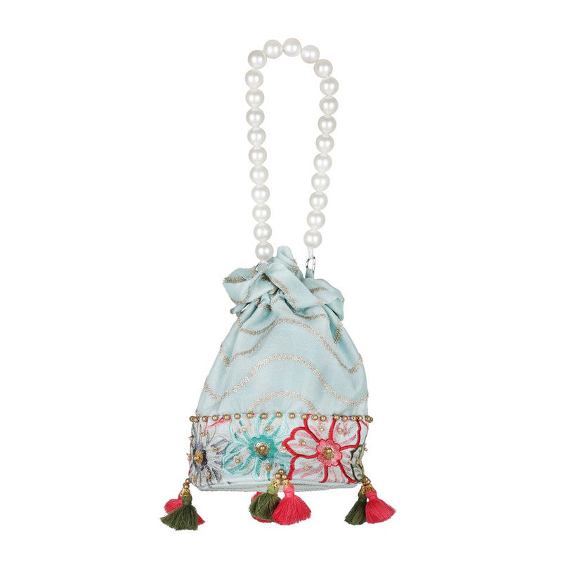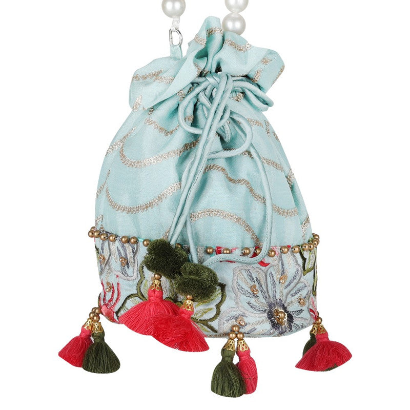 Adorable potli bag with sequins detailing, a pearl-beaded handle, and a charming tasselperfect for the stylish girl seeking elegance and charm.