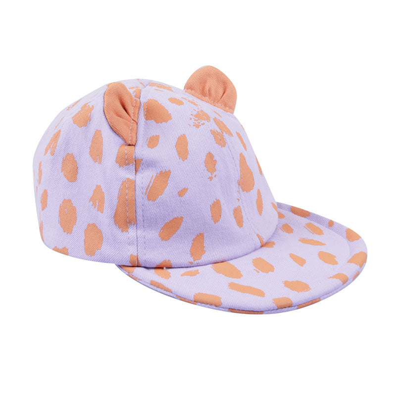 Lilac hat with visor, in organic cotton, with elastic back. It is embellished with ears on top and all-over orange print.