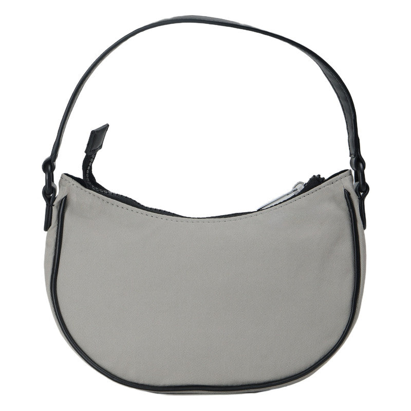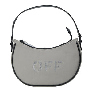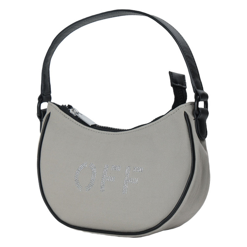 This chic gray crescent-shaped bag features a sleek black shoulder strap. The front is boldly adorned with a sparkling 'OFF' logo made of glistening rhinestones, offering high-end glamour.