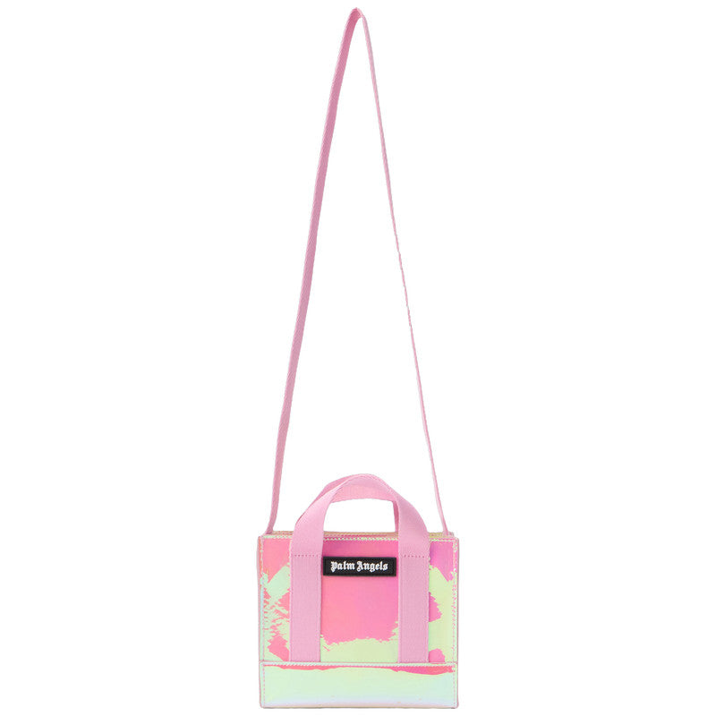 This playful Palm Angels mini-tote features a vibrant, iridescent finish that shifts color, topped with pink straps and a woven logo patch. Perfect for stylish kids.